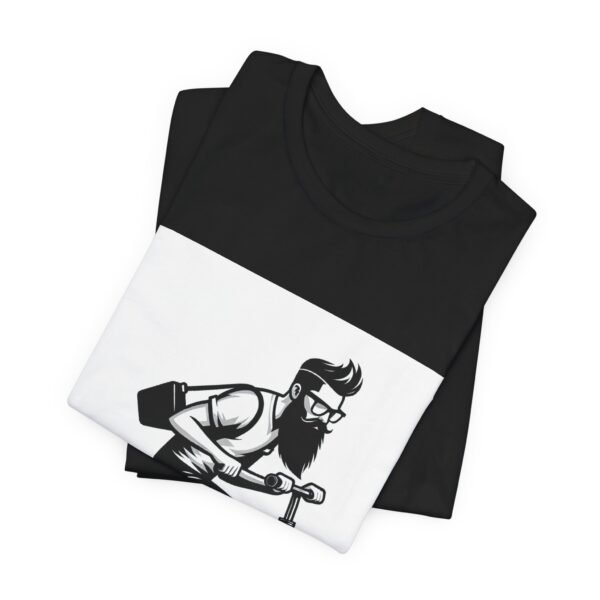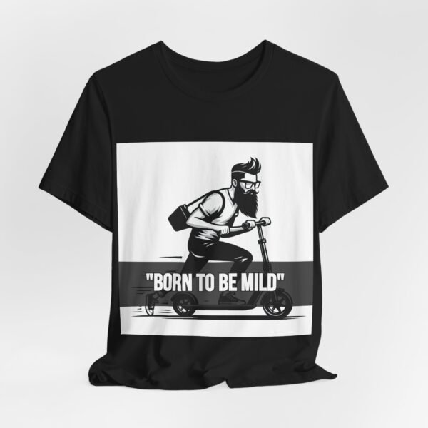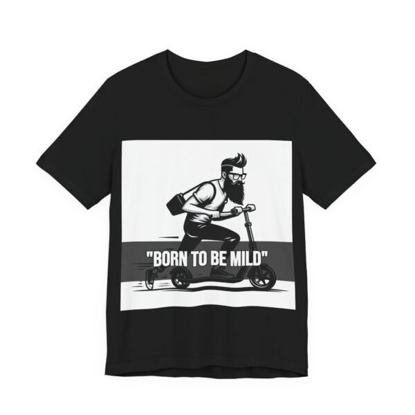 A unique AI-generated custom shirt design. Single bearded hipster nerd riding a scooter in minimalist black silhouette style for “Born to be Mild” shirt design
