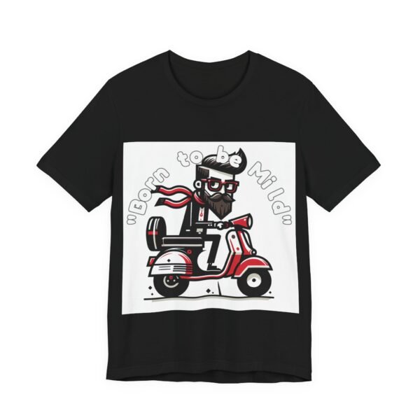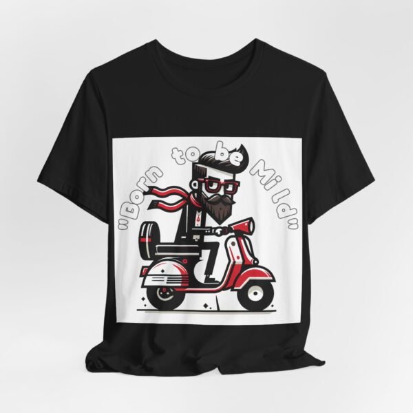 A unique AI-generated custom shirt design. Bold cartoon illustration of a bearded nerdy character riding a scooter in black, red, and white colors. Clean vector style with strong outlines that parodies rebel biker culture with a wholesome twist. Text “Born to be Mild” as separate layer.